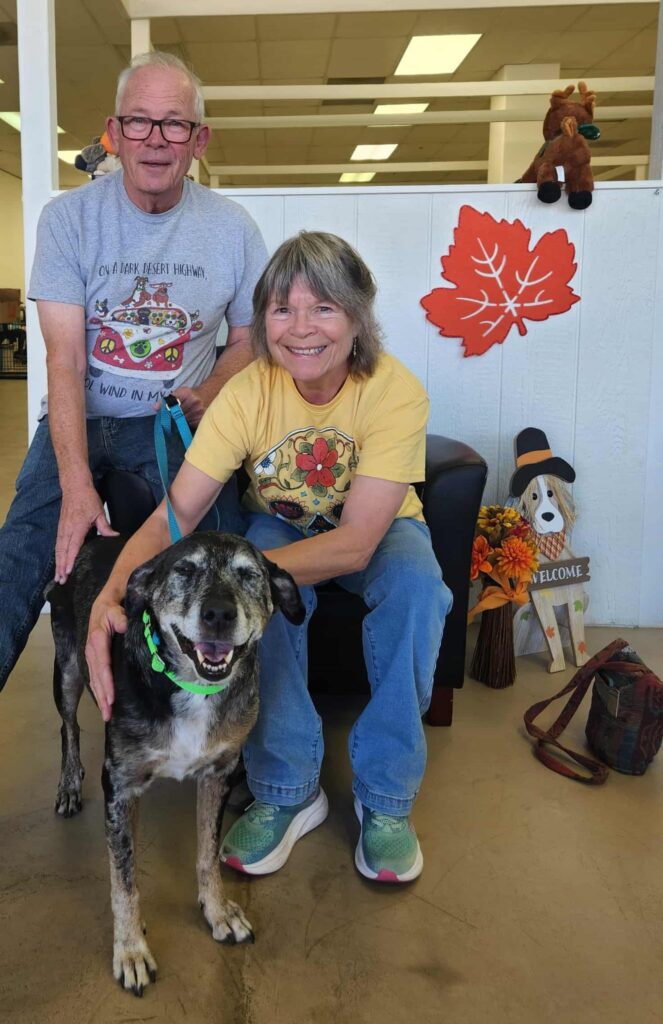 These are the wonderful folks who took Chewy way back when, who wanted to eat the cats, but they kept him as a foster and brought him daily to TRN until we helped him find a new home. Then they brought home Bear, who became Grainger, whose end came far too soon and very unexpectedly when he passed and they found his body was riddled with cancer. He absolutely loved the last chapter of his life with them and his indoor cat buddy. After some healing time, they again opened their hearts and home to another wonderful senior pup. This time, it was Mimzie.