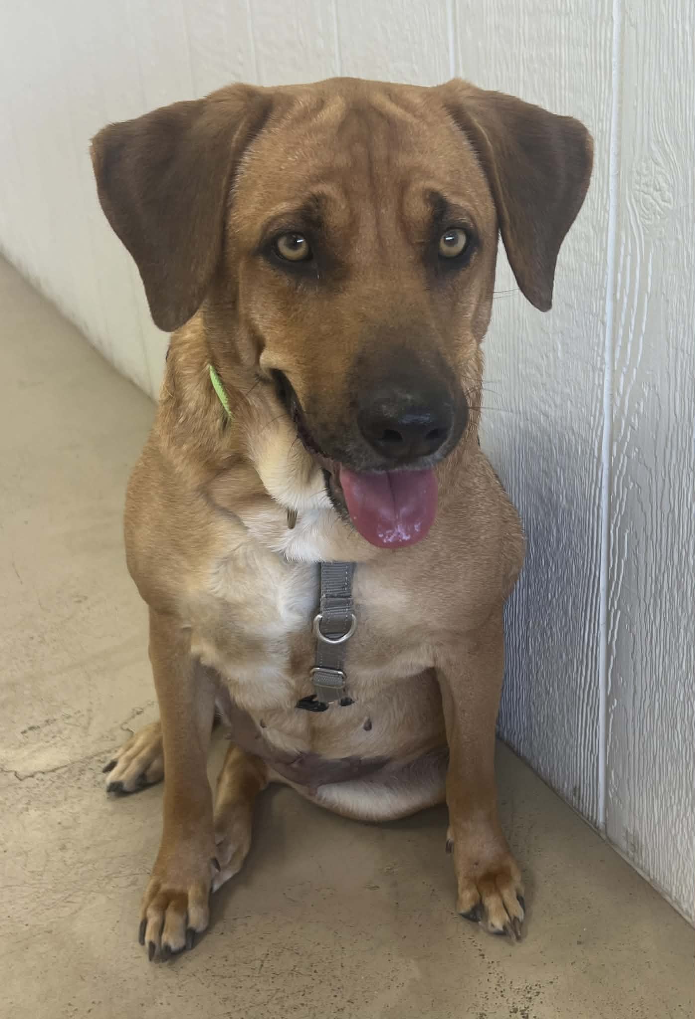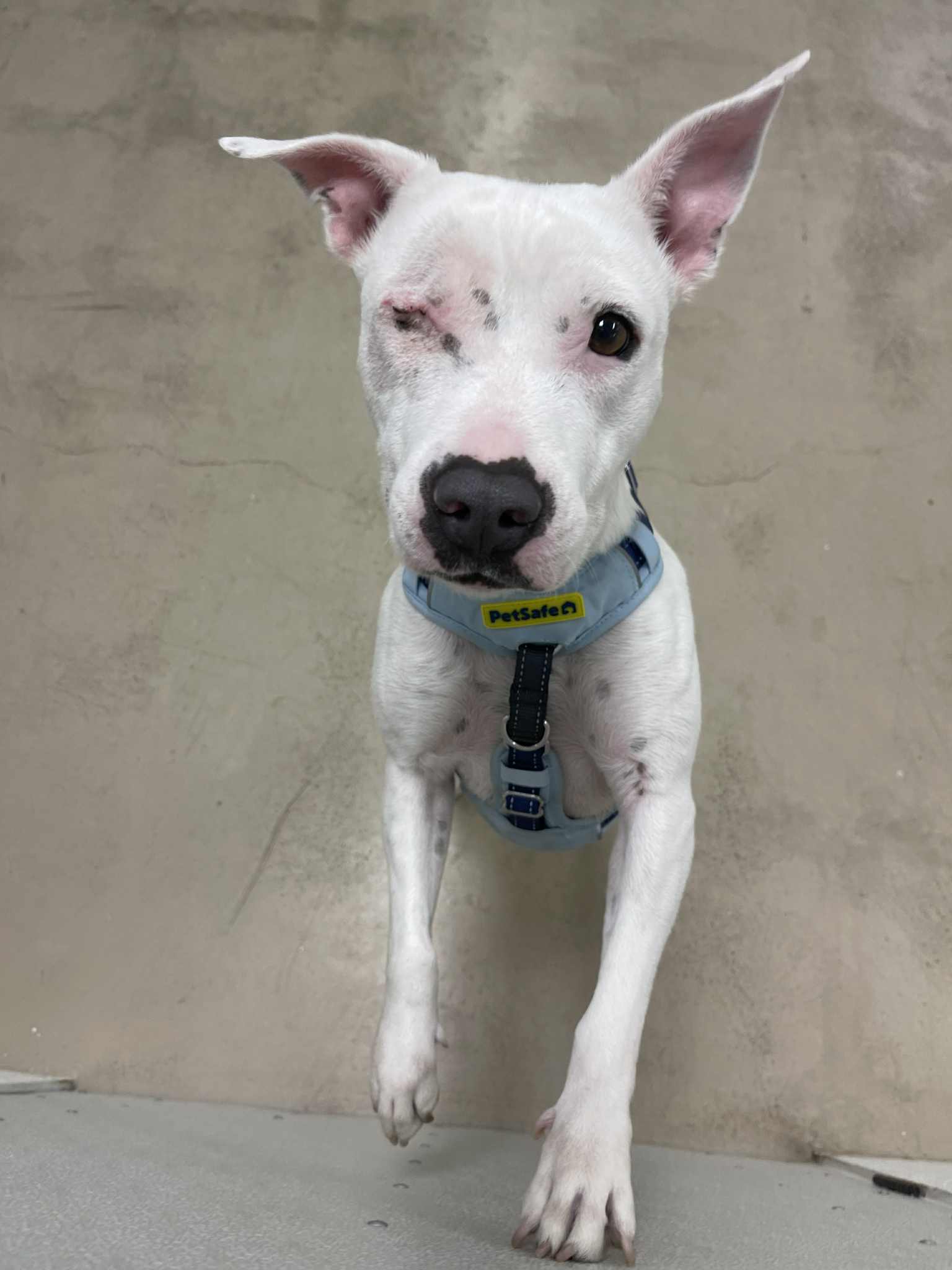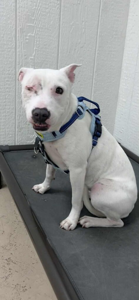 Dally arrived at the shelter when her owners could no longer keep her. She has previously lived with other dogs (large and small according to her notes), so she could do well with a calm and confident (but not bossy) doggy friend. She came in with an old injury to her eye that was not properly treated, and the shelter had to remove her eye. She’s settled in at her foster home and is learning how to be a dog (notes say she previously lived outside). She is a very low key dog until she feels safe, and then her young playful side shows through. She is a very nice size and just looking for a place to call her very own. She is available to adopt.