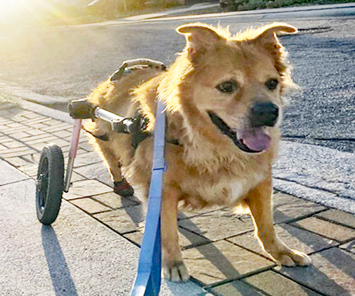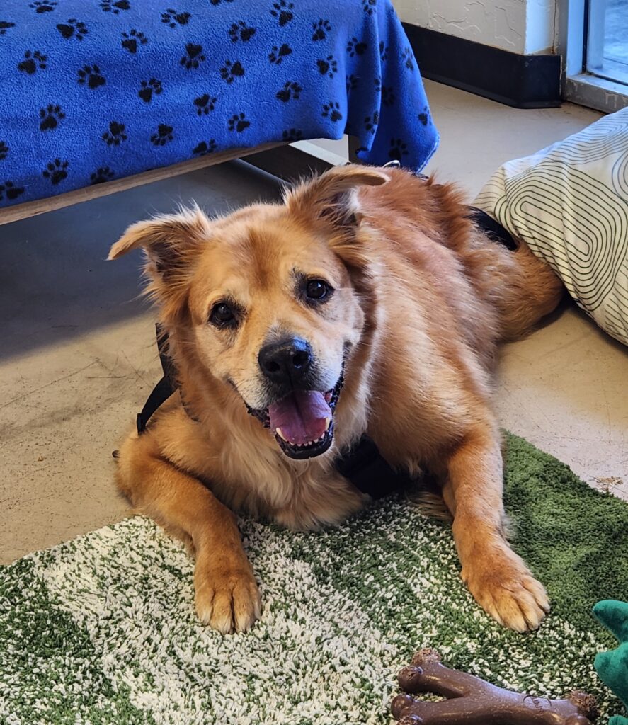 Pup came to the shelter last summer after he lost his owner. Severely overweight and with some significant health issues, he was lucky to land in a loving foster home right away. During his time with his foster, he has lost a tremendous amount of weight and thanks to help from Friends of PACC, he is visiting our neighbor, A Loyal Companion, where he gets swim therapy and has learned to use his doggy wheelchair, which has improved his quality of life–he gets to go for walks with his foster crew now! His wheels are part of the package deal with this great boy. He’s housebroken, gets along with big and little dogs in the home (he’d love to meet any new doggy pals), and he’s looking for a loving home to spend all of his golden tomorrows. He is available to adopt.